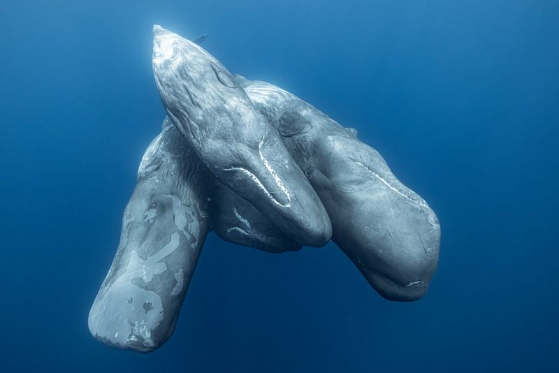 Stéphane Granzotto is renowned for his spectacular images of sperm whales, such as this photograph, taken in the Indian Ocean. "While I was diving to try to photograph the social life of a group of sperm whales in Mauritius, this adult female swam towards me, and brushed right past me," he says. "She stayed like this for a few seconds, and offered me her caudal fin. An unforgettable moment!" Taken on a Canon EOS 5D Mark III (now succeeded by the Canon EOS 5D Mark IV) with a Canon EF 16-35mm f/4L IS USM lens at 16mm, 1/200 sec, f/4 and ISO 160. © Stéphane Granzotto